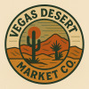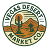 Items arranged on a plain surface: a cardboard box, a red game controller, an orange travel mug, and a small cactus in a terracotta pot, with text on the left reading "Vegas Desert Market Co."